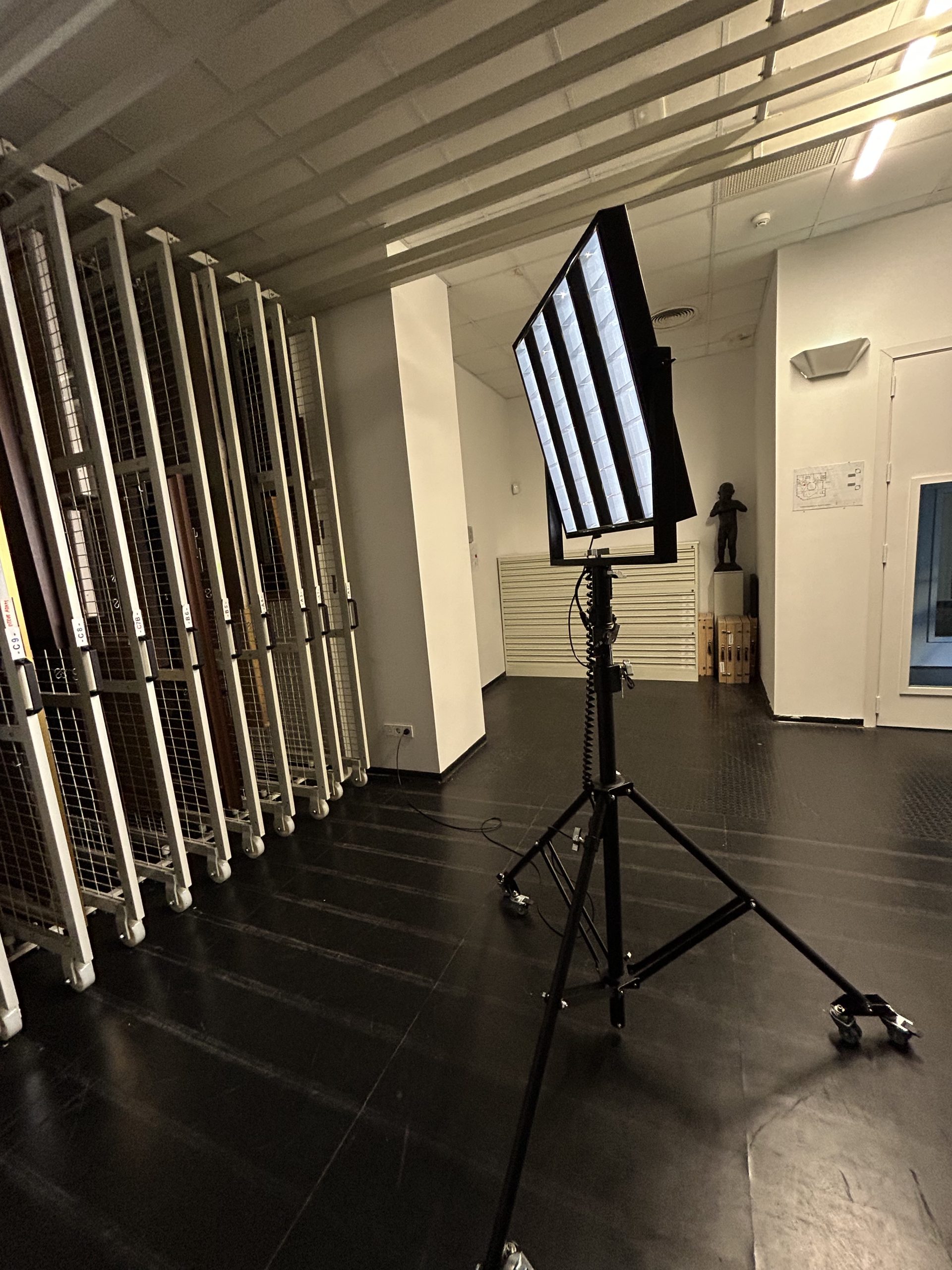 Con ese criterio diseñamos nuestras luminarias auxiliares, que son regulables en intensidad, y están montadas sobre un robusto trípode con ruedas y frenos que permiten poner la luminaria en cualquier posición y altura hasta los 3.5 metros. La disposición de las patas permite que una de ellas se deslice cómodamente sobre las mesas de trabajo, y poder dejar la luminaria trabajando en el plano más vertical posible.